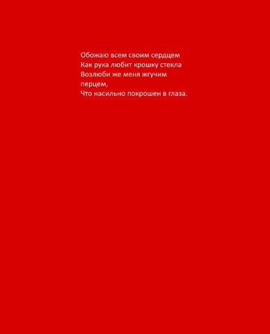 Обожаю всем своим сердцем Как рука любит крошку стекла Возлюби же меня жгучим перцем, Что насильно покрошен в глаза.
