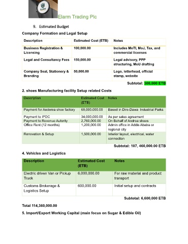 Description Estimated Cost (ETB) Notes