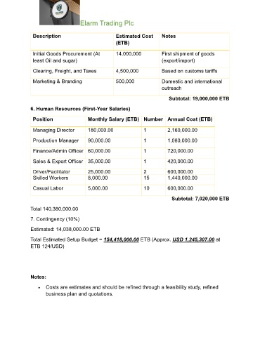 Total Estimated Setup Budget = 154,418,000.00 ETB (Approx. USD 1,245,307.00 at