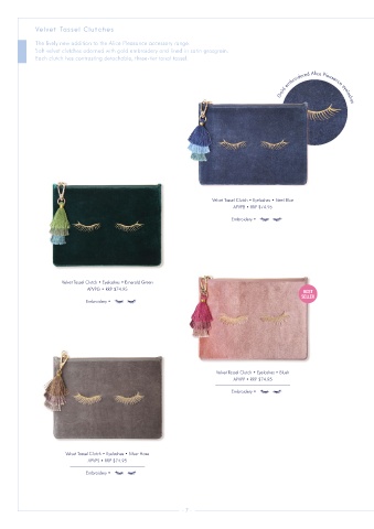 Each clutch has contrasting detachable, three-tier tonal tassel. Gold embroidered Alice Pleasance eyelashes