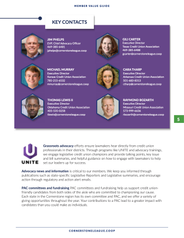 Grassroots advocacy efforts ensure lawmakers hear directly from credit union professionals in their districts. Through programs like UNITE and advocacy trainings, we engage legislative credit union champions and provide talking points, key issue and bill summaries, and helpful guidance on how to engage with lawmakers to help set our leaders up for success.