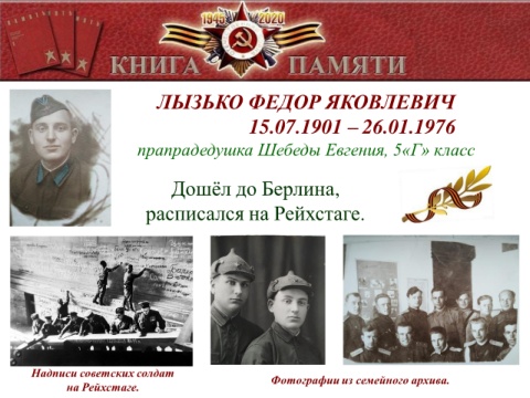 ЛЫЗЬКО ФЕДОР ЯКОВЛЕВИЧ 15.07.1901 – 26.01.1976 прапрадедушка Шебеды Евгения, 5«Г» класс Дошёл до Берлина, расписался на Рейхстаге. Надписи советских солдат Фотографии из семейного архива. на Рейхстаге.