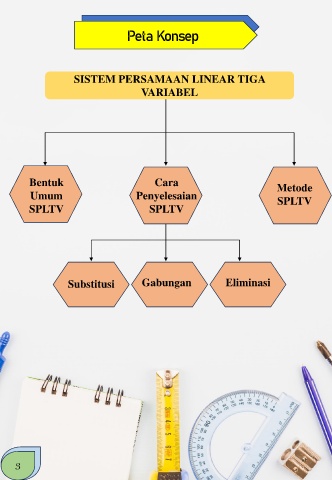 Peta Konsep SISTEM PERSAMAAN LINEAR TIGA VARIABEL Bentuk Cara Metode Umum Penyelesaian SPLTV SPLTV SPLTV Substitusi Gabungan Eliminasi 6 3