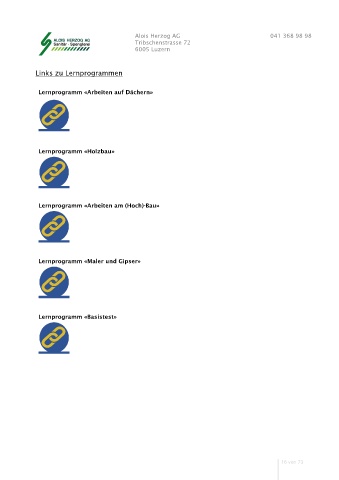 Alois Herzog AG 041 368 98 98 Tribschenstrasse 72 6005 Luzern Links zu Lernprogrammen Lernprogramm «Arbeiten auf Dächern» Lernprogramm «Holzbau» Lernprogramm «Arbeiten am (Hoch)-Bau» Lernprogramm «Maler und Gipser» Lernprogramm «Basistest» 16 von 73