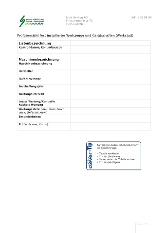 Prüfübersicht fest installierter Werkzeuge und Gerätschaften (Werkstatt)