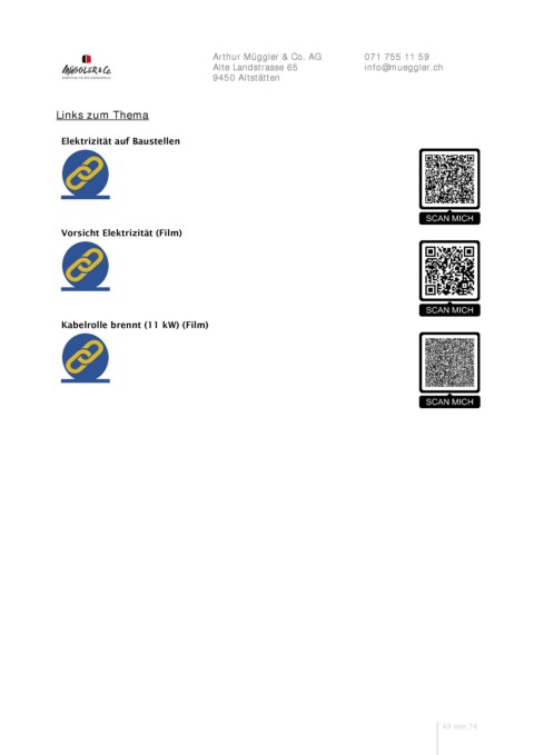 Arthur Müggler & Co. AG 071 755 11 59 Alte Landstrasse 65 info@mueggler.ch 9450 Altstätten Links zum Thema Elektrizität auf Baustellen Vorsicht Elektrizität (Film) Kabelrolle brennt (11 kW) (Film) 43 von 74