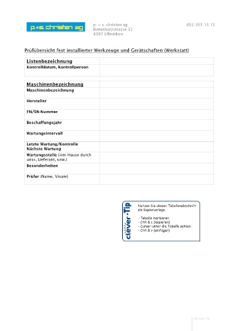Prüfübersicht fest installierter Werkzeuge und Gerätschaften (Werkstatt)
