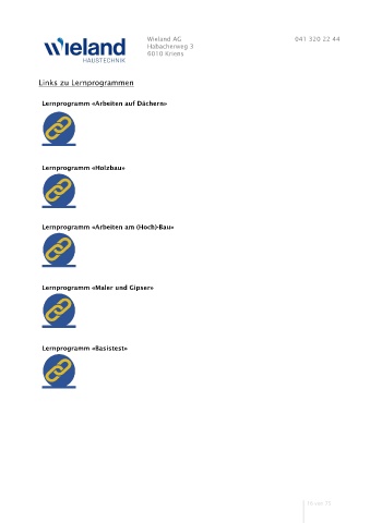 Wieland AG 041 320 22 44 Habacherweg 3 6010 Kriens Links zu Lernprogrammen Lernprogramm «Arbeiten auf Dächern» Lernprogramm «Holzbau» Lernprogramm «Arbeiten am (Hoch)-Bau» Lernprogramm «Maler und Gipser» Lernprogramm «Basistest» 16 von 75