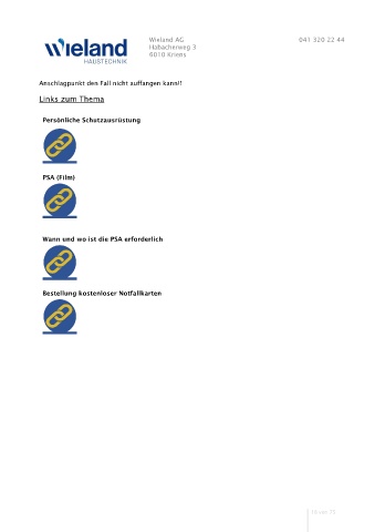 Wieland AG 041 320 22 44 Habacherweg 3 6010 Kriens Anschlagpunkt den Fall nicht auffangen kann!! Links zum Thema Persönliche Schutzausrüstung PSA (Film) Wann und wo ist die PSA erforderlich Bestellung kostenloser Notfallkarten 18 von 75