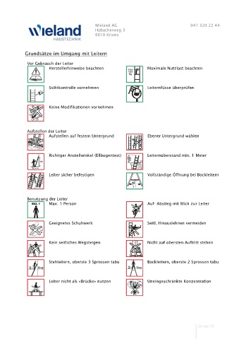 Richtiger Anstellwinkel (Ellbogentest) Leiternüberstand min. 1 Meter