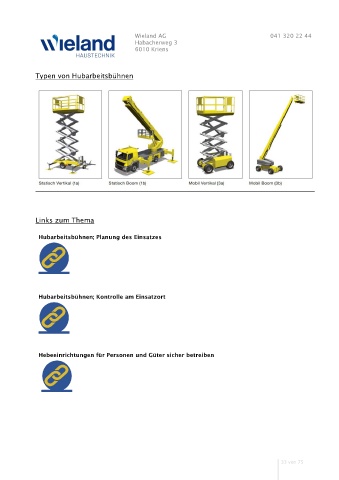 Wieland AG 041 320 22 44 Habacherweg 3 6010 Kriens Typen von Hubarbeitsbühnen Links zum Thema Hubarbeitsbühnen; Planung des Einsatzes Hubarbeitsbühnen; Kontrolle am Einsatzort Hebeeinrichtungen für Personen und Güter sicher betreiben 33 von 75