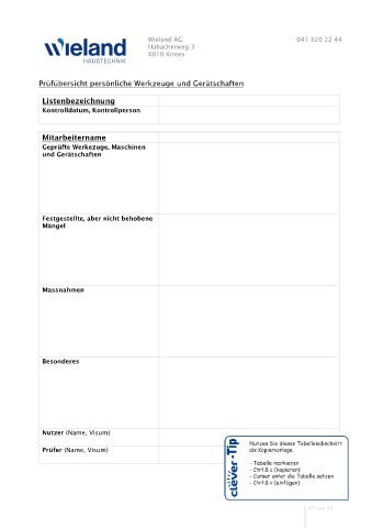 Prüfübersicht persönliche Werkzeuge und Gerätschaften