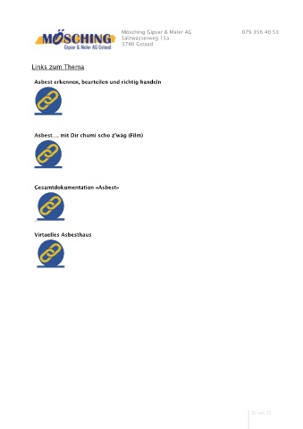 Mösching Gipser & Maler AG 079 356 40 53 Salzwasserweg 15a 3780 Gstaad Links zum Thema Asbest erkennen, beurteilen und richtig handeln Asbest…. mit Dir chumi scho z’wäg (Film) Gesamtdokumentation «Asbest» Virtuelles Asbesthaus 35 von 75