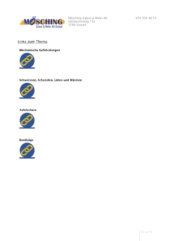 Mösching Gipser & Maler AG 079 356 40 53 Salzwasserweg 15a 3780 Gstaad Links zum Thema Mechanische Gefährdungen Schweissen, Schneiden, Löten und Wärmen Tafelschere Bandsäge 39 von 75