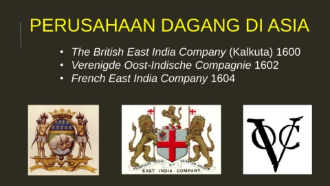 PERUSAHAAN DAGANG DI ASIA • The British East India Company (Kalkuta) 1600 • Verenigde Oost-Indische Compagnie 1602 • French East India Company 1604