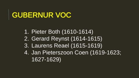 GUBERNUR VOC 1. Pieter Both (1610-1614) 2. Gerard Reynst (1614-1615) 3. Laurens Reael (1615-1619) 4. Jan Pieterszoon Coen (1619-1623; 1627-1629)