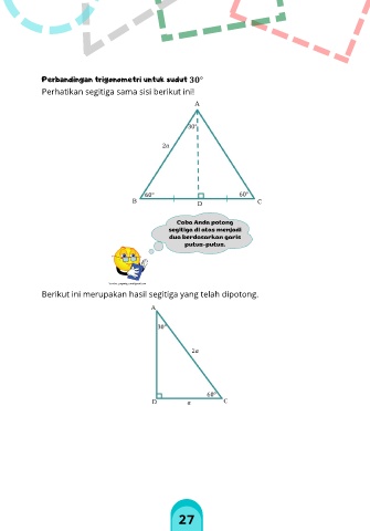 Perbandingan trigonometri untuk sudut Perhatikan segitiga sama sisi berikut ini! Coba Anda potong segitiga di atas menjadi dua berdasarkan garis putus-putus. Sumber: pngwing.com@gmail.com Berikut ini merupakan hasil segitiga yang telah dipotong. 27
