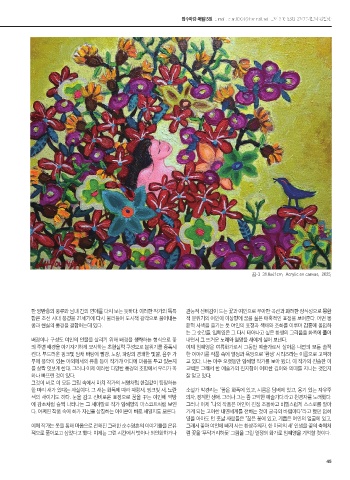 한 마리 새가 있다는 사실이다. 그 새는 화폭에 따라 파랑새, 핑크빛 새, 노란 소설가 박경리는 “꿈은 화폭에 있고, 시름은 담배에 있고, 용기 있는 자유주