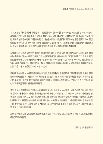 그런 의미에서 그의 닭 그림은 세화로서의 성격에 갇히지 않고 그 자신의 미적 감수성 및 조형감각을