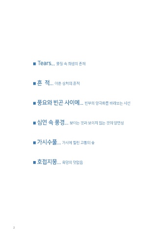 ■ Tears... 물질 속 희생의 존재 ■ 흔 적... 아픈 상처의 흔적 ■ 풍요와 빈곤 사이에... 빈부의 양극화를 바라보는 시선 ■ 심연 속 풍경... 보이는 것과 보이지 않는 것의 양면성 ■ 가시수풀... 가시에 찔린 고통의 숲 ■ 호접지몽... 욕망의 덧없음 2