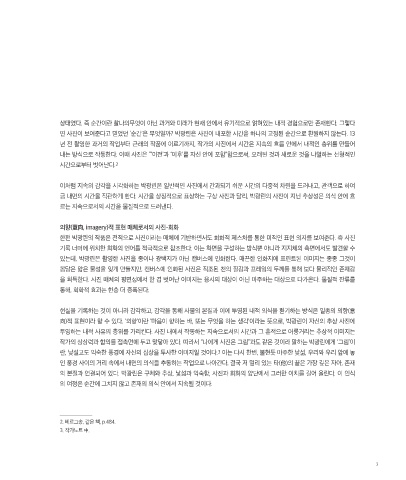 내는 방식으로 작동한다. 이때 사진은 “’이전’과 ‘이후’를 자신 안에 포함”함으로써, 오래된 것과 새로운 것을 나열하는 선형적인