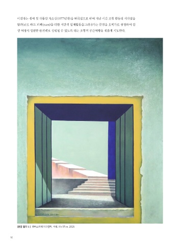 이진자는 생애 첫 작품인 자소상(1977년작)을 변곡점으로 하여 지난 시간 조형 활동의 시작점을 알파(a)로 하고 괴체(mass)를 더한 시간적 입체활동을그려나가는 끝점을 오메가로 설정하여 인 생 여정이 영원한 완전체로 성립될 수 있도록 하는 조형적 공간여행을 새롭게 시도한다. [문을 열다Ⅱ] 캔버스위에 아크릴릭, 석채, 91x117cm, 2025 10