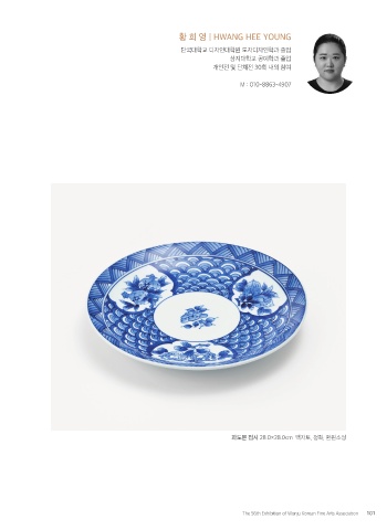 황 희 영 | HWANG HEE YOUNG 단국대학교 디자인대학원 도자디자인학과 졸업 상지대학교 공예학과 졸업 개인전 및 단체전 30회 내외 참여 M : 010-8863-4907 파도문 접시 28.0×28.0cm 백자토, 청화, 환원소성 The 56th Exhibition of Wonju Korean Fine Arts Association 101