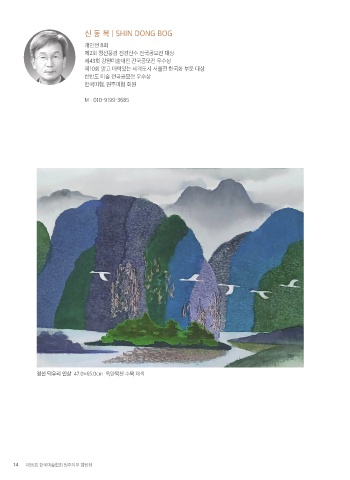신 동 복 | SHIN DONG BOG 개인전 8회 제2회 정선풍경 진경산수 전국공모전 대상 제43회 강원미술대전 전국공모전 우수상 제10회 맑고 매력있는 세계도시 서울전 한국화 부문 대상 한반도 미술 전국공모전 우수상 한국미협, 원주미협 회원 M : 010-9199-3685 정선 덕우리 인상 47.0×65.0cm 옥양목천 수묵 채색 14 제56회 한국미술협회 원주지부 회원전