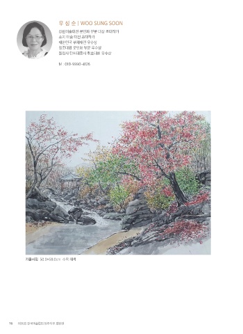우 성 순 | WOO SUNG SOON 강원미술대전 문인화 부문 대상 초대작가 소치 미술 대전 초대작가 대한민국 부채대전 우수상 정조대왕 문인화 부문 우수상 월정사 탄허대종사 휘호대회 우수상 M : 010-9990-4126 가을서정 50.0×58.0cm 수묵 채색 16 제56회 한국미술협회 원주지부 회원전