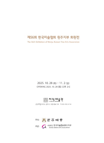 제56회 한국미술협회 원주지부 회원전 The 56th Exhibition of Wonju Korean Fine Arts Association 2025. 10. 28 (화) – 11. 2 (일) OPENING 2025. 10. 28 (화) 오후 3시 강원특별자치도 원주시 서원대로 331 T.033-763-9114 주최 : 원 주 예 총 사단법인 한국미술협회원주지부 주관 : WONJU KOREAN ARTS ASSOCIATION