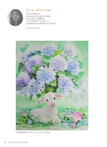 김 소 영 | KIM SO YOUNG 2025 첫 번째 개인전 2022-2025 원주수채화작가회 회원전 2022-2025 원주미협회원전 아이러브아트원주전 및 그룹전 다수 강원미술공모전,신사임당미술대전등 입선다수 M : 010-9373-4335 수국그늘 아래서 60.6×50.0cm Watercolor on paper 28 제56회 한국미술협회 원주지부 회원전