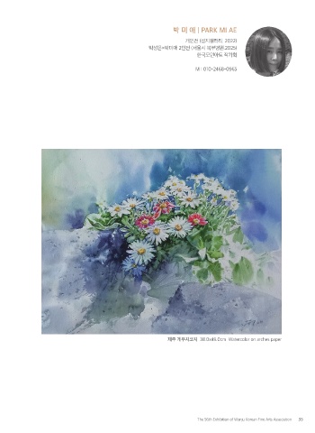 박 미 애 | PARK MI AE 개인전 (성지갤러리. 2022) 박성은×박미애 2인전 (서울시 북부병원.2025) 한국모던아트 작가회 M : 010-2468-0965 제주 게우지코지 38.0x49.0cm Watercolor on arches paper The 56th Exhibition of Wonju Korean Fine Arts Association 35