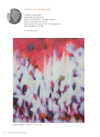 이 영 채 | LEE YOUNG CHAE 경북대학교 서양화전공 졸업 同교육대학원 미술교육전공 졸업 대한민국 회화대전 특선다수 / 강원미술대전 입상다수 대한민국 여성미술대전 특선·동상다수 개인전,초대개인전,부스개인전 각 1회 그외 초대전,단체전 다수 現)한국미술협회 원주지부 회원 M : 010-4059-3253 Meditation-花(화) 72.7×60.6cm Oil on canvas 52 제56회 한국미술협회 원주지부 회원전