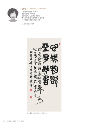 권 영 이 | KWON YEUNG LEE 대한민국 미술대전 초대작가 강원미술대전 초대작가 강원미술대전 운영위원, 심사역임 한국서예가협회, 국제여성한문서법학회, 국서련강원지회, 문향묵연회 화원 M : 010-9082-1907 채근담구 110.0×70.0cm 화선지, 먹 64 제56회 한국미술협회 원주지부 회원전
