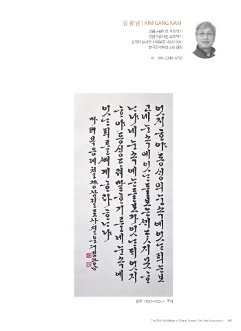 김 광 남 | KIM GANG NAM 강원교원미전 초대작가 강원미술대전 초대작가 강원미술대전 서예부문 대상(1992) 한국전각학연구회 회원 M : 010-3348-6797 성구 113.0×43.0cm 족자 The 56th Exhibition of Wonju Korean Fine Arts Association 65