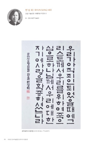 변 성 희 | BYUN SUNG HEE 강원 미술대전 서예부분 추천작가 M : 010-8977-8403 성구로마서 5장8절 57.0×33.0cm 먹, 화선지 70 제56회 한국미술협회 원주지부 회원전