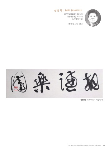 심 상 덕 | SHIM SANG DUK 대한민국미술대전 초대작가 강원미술대전 초대작가 동주서예연구실 M : 010-5369-9854 相謙樂園 13.0×40.0㎝ 화선지, 먹 The 56th Exhibition of Wonju Korean Fine Arts Association 71