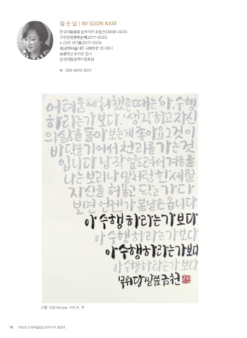 임 순 남 | IM SOON NAM 한국미술협회 원주지부 회원전(2008~2024) 무위당생명예술제(2017~2022) I LOVE ART展(2017~2025) 現)강원미술대전 서예부문 초대작가 늘봄학교 한자반 강사 한국미협,원주미협회원 M : 010-9079-2077 수행 21.0×15.5cm 카드지, 먹 78 제56회 한국미술협회 원주지부 회원전