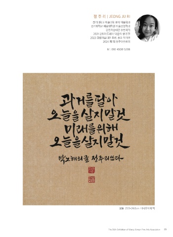 정 주 리 | JEONG JU RI 경기대학교 예술대학 문자 예술학과 경기대학교 예술대학원 미술경영학과 강원미술대전 추천작가 2021 강원아트페어 ‘마음의 향기’전 2023 강원미술대전 추천, 초대 작가전 2024 제1회 원주아트페어 M : 010-4508-5208 오늘 23.5×24.0cm 대나무지에 먹 The 56th Exhibition of Wonju Korean Fine Arts Association 79
