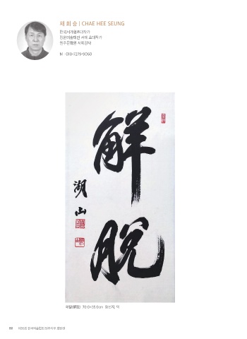 채 희 승 | CHAE HEE SEUNG 한국서가협초대작가 강원미술대전 서예 초대작가 원주문화원 서예강사 M : 010-7279-9060 해탈(解脫) 70.0×35.0cm 화선지, 먹 80 제56회 한국미술협회 원주지부 회원전