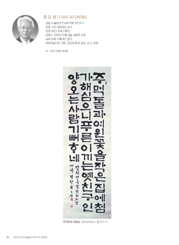 최 조 생 | CHOI JO SAENG 강원 미술대전 한국화부문 추천작가 강원 교원 미술대전 초대 강원 60인 초대 서화전 강원도 요령성 국제 미술 서화전 초대 님의 침묵 서예대전 초대 강원미술대전 서예, 문인화 대전 운영, 심사, 초대 M : 010-2456-8781 주먹돌과 여원꽃 130.0x35.0m 화선지, 먹 82 제56회 한국미술협회 원주지부 회원전