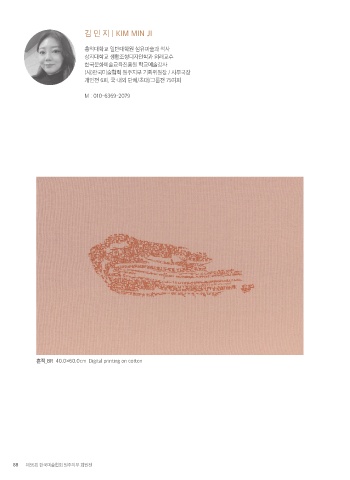 김 민 지 | KIM MIN JI 홍익대학교 일반대학원 섬유미술과 석사 상지대학교 생활조형디자인학과 외래교수 한국문화예술교육진흥원 학교예술강사 (사)한국미술협회 원주지부 기획위원장 / 사무국장 개인전 6회, 국·내외 단체/초대/그룹전 75여회 M : 010-6369-2079 흔적_BR 40.0×60.0cm Digital printing on cotton 88 제56회 한국미술협회 원주지부 회원전