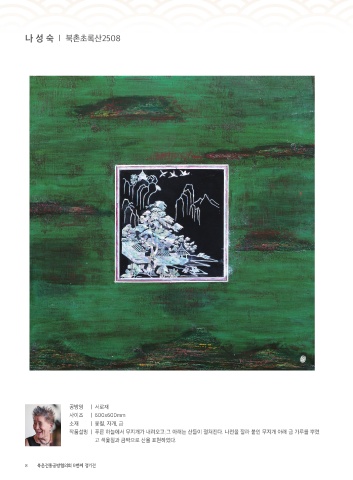 나성숙 l 북촌초록산2508 박경귀 l 일오구 만월 공방명 ㅣ 서로재 공방명 ㅣ 선불화공방 사이즈 ㅣ 600x600mm 사이즈 ㅣ 45x38cm 소재 ㅣ 옻칠, 자개, 금 소재 ㅣ 천 위에 분채 작품설명 ㅣ 푸른 하늘에서 무지개가 내려오고 그 아래는 산들이 펼쳐진다. 나전을 잘라 붙인 무지개 아래 금 가루를 뿌렸 고 색옻칠과 금박으로 산을 표현하였다. 8 북촌전통공방협의회 9번쩨 정기전 9