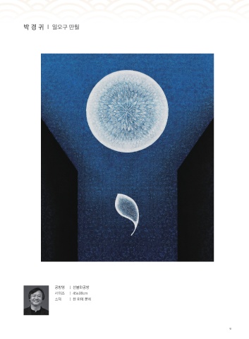 나성숙 l 북촌초록산2508 박경귀 l 일오구 만월 공방명 ㅣ 서로재 공방명 ㅣ 선불화공방 사이즈 ㅣ 600x600mm 사이즈 ㅣ 45x38cm 소재 ㅣ 옻칠, 자개, 금 소재 ㅣ 천 위에 분채 작품설명 ㅣ 푸른 하늘에서 무지개가 내려오고 그 아래는 산들이 펼쳐진다. 나전을 잘라 붙인 무지개 아래 금 가루를 뿌렸 고 색옻칠과 금박으로 산을 표현하였다. 8 북촌전통공방협의회 9번쩨 정기전 9