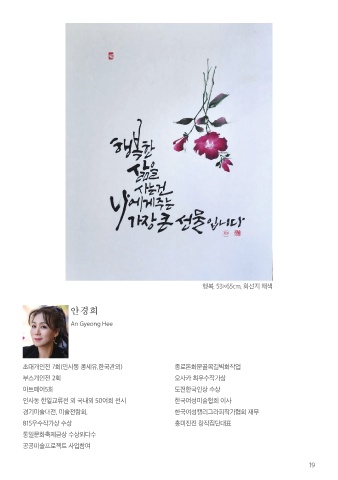 행복, 53×65cm, 화선지 채색 안경희 An Gyeong Hee 초대개인전 7회(인사동 콩세유,한국관외) 종로돈화문골목길벽화작업 부스개인전 2회 오사카 최우수작가상 아트페어5회 도전한국인상 수상 인사동 한일교류전 외 국내외 50여회 전시 한국여성미술협회 이사 경기미술대전, 미술전람회, 한국여성캘리그라피작가협회 재무 815우수작가상 수상 흥미진진 창작집단대표 통일문화축제금상 수상외다수 공공미술프로젝트 사업참여 19