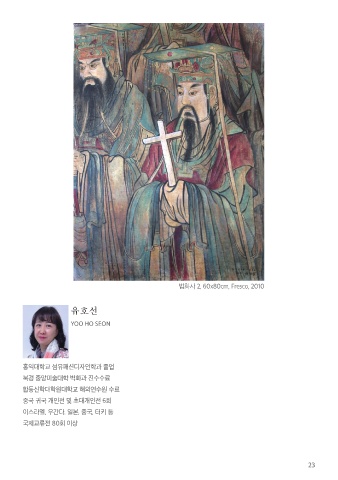 법화사 2, 60x80cm, Fresco, 2010 유호선 YOO HO SEON 홍익대학교 섬유패션디자인학과 졸업 북경 중앙미술대학 벽화과 진수수료 합동신학대학원대학교 해외연수원 수료 중국 귀국 개인전 및 초대개인전 6회 이스라엘, 우간다. 일본, 중국, 터키 등 국제교류전 80회 이상 23