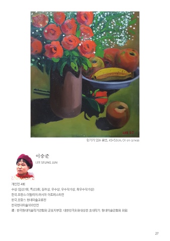 향기가 있는 왈츠, 45×53cm, Oil on canvas 이승준 LEE SEUNG JUN 개인전 4회 수상 (입선7회, 특선3회, 장려상, 우수상, 우수작가상, 최우수작가상) 한국.프랑스.이탈리아.러시아 아트페스타전 한국.프랑스 현대미술교류전 한국현대미술100인전 現 : 한국현대미술작가연합회 군포지부장. 대한민국회화대상전 초대작가. 현대미술인협회 회원. 27