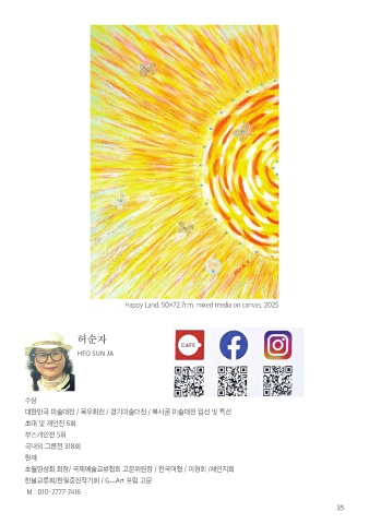 Happy Land, 50×72.7cm, mixed media on canvas, 2025 허순자 HEO SUN JA 수상 대한민국 미술대전 / 목우회전 / 경기미술대전 / 복사골 미술대전 입선 및 특선 초대 및 개인전 6회 부스개인전 5회 국내외 그룹전 318회 현재 초월영성회 회장/ 국제예술교류협회 고문위원장 / 한국미협 / 이형회 /체인지회 한불교류회/한일중진작가회 / GㅡArt 포럼 고문 M : 010-2777-7416 35