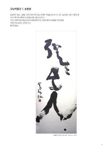 규남박물관 ㅣ 송홍범 잘잘못은 ‘옳고 그름을 가르되 정죄하지 않고 관계와 책임을 살피며 더 나은 길을 찾는 깊은 분별의 말’ 2025 목포항구축제 파시마당(서예 거필 퍼포먼스) 2025 국제수묵비엔날레 한국서예정예작가전, 유달산에부는바람展 추진위원장 개인전 및 초대전, 단체전 다수 現 죽전화실 잘잘못 화선지에 수묵, 족자 50x135cm 2025 9
