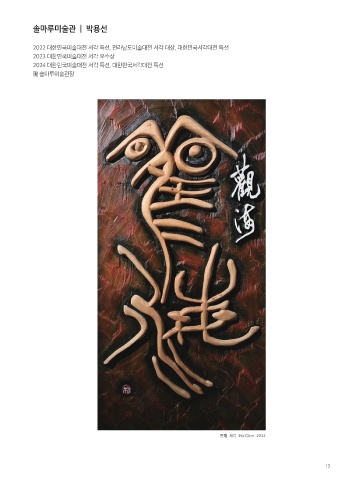 솔마루미술관 ㅣ 박용선 2022 대한민국미술대전 서각 특선, 전라남도미술대전 서각 대상, 대한민국서각대전 특선 2023 대한민국미술대전 서각 우수상 2024 대한민국미술대전 서각 특선, 대한민국서각대전 특선 現 솔마루미술관장 관해 서각 35x70cm 2024 13